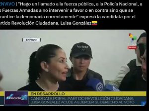 A propósito, González llamó a la fuerza pública, a la Policía Nacional y a las Fuerzas Armadas del Ecuador a no intervenir en el conteo de votos, sino a garantizar la democracia. Asimismo, indicó que la víspera tuvo reportes de inteligencia sobre intentos de sembrar actas marcadas, falsos positivos que denunció en sus redes digitales.