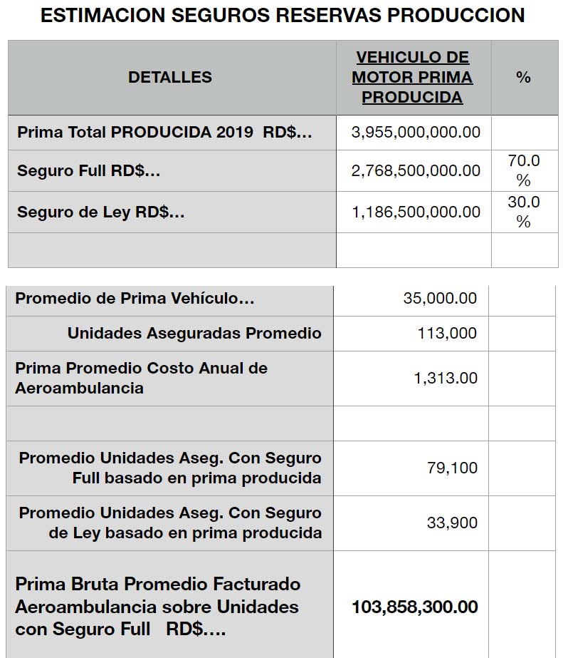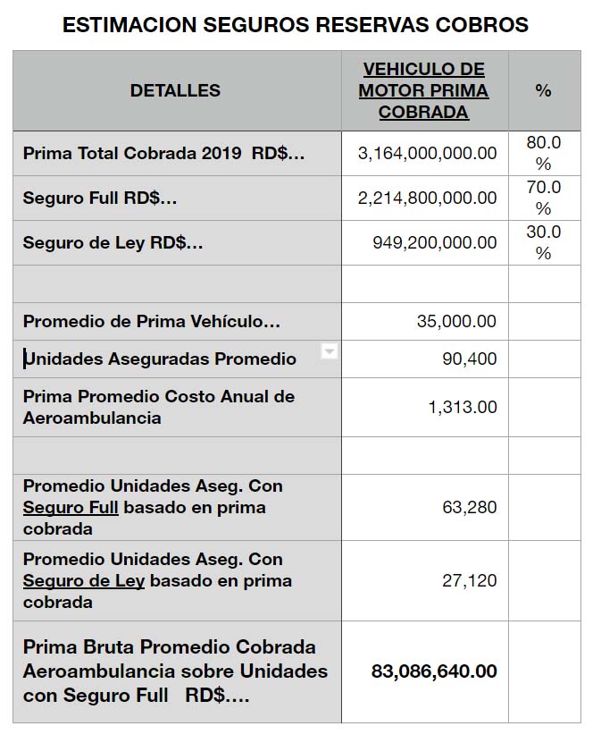 El costo del servicio Aeroambulancia es de unos RD$1,313 por unidad. En estos cálculos no se contemplan las pólizas de vehículos con cobertura de daños a terceros (seguros de ley), pues en estas la cobertura es opcional y no obligatoria. De acuerdo con un análisis estadístico, debería por lo menos el 30% llegar a obtener el servicio de manera contratada. De haberlo hecho así, estaríamos hablando de 32,000 unidades aseguradas y que el 30% adquiera el servicio de manera contratada hablamos de .. 9,600 unidades a un costo de 1,100.00 .