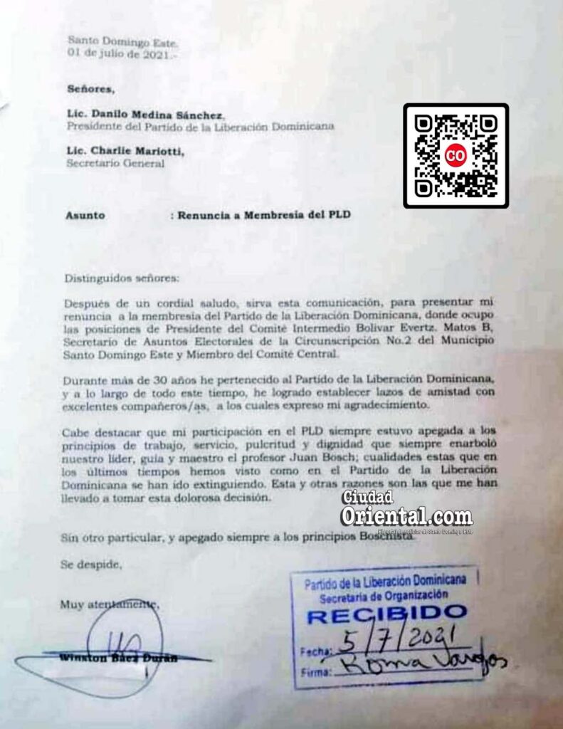 Le dice a Medina, además, que que «durante más de 30 años he pertenecido al Partido de la Liberación Dominicana, y a lo largo de todo este tiempo, he logrado establecer lazos de amistad con excelentes compañeros/as, a los cuales expreso mi agradecimiento».