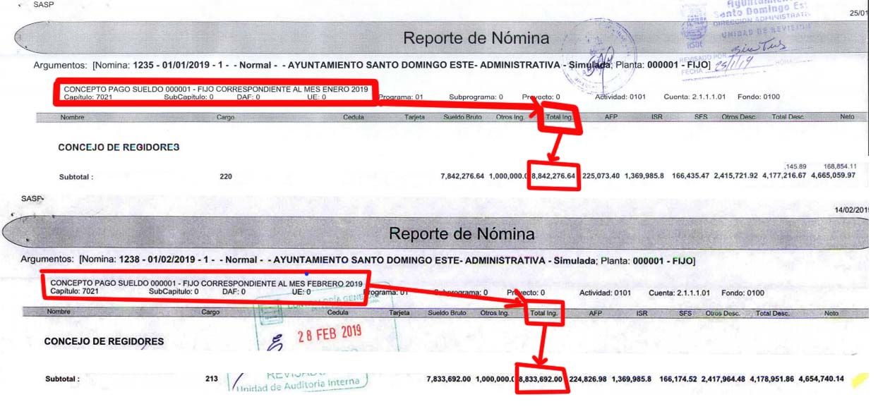 Solo por concepto del pago de nómina, el Concejo de Regidores del Ayuntamiento de Santo Domingo Este «se tragó» durante los meses de Enero y Febrero de este año la nada despreciable suma de 17 millones, 675 mil, 968 pesos con 64 centavos (RD$17,675.968.64).