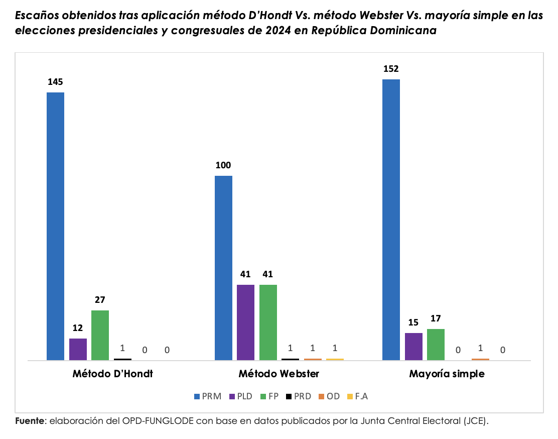 “El PRM (partido que obtuvo la mayor cantidad de escaños con D’Hondt), hubiera resultado aún más favorecido con una fórmula de mayoría simple, al pasar de 145 a 152 diputados (145 territoriales y 7 del exterior), es decir, siete más; en tanto que, el partido FP pasaría de 27 a 17 diputados (10 menos), y el PLD apenas aumentaría tres más, pasando de 12 a 15”, destaca el estudio.