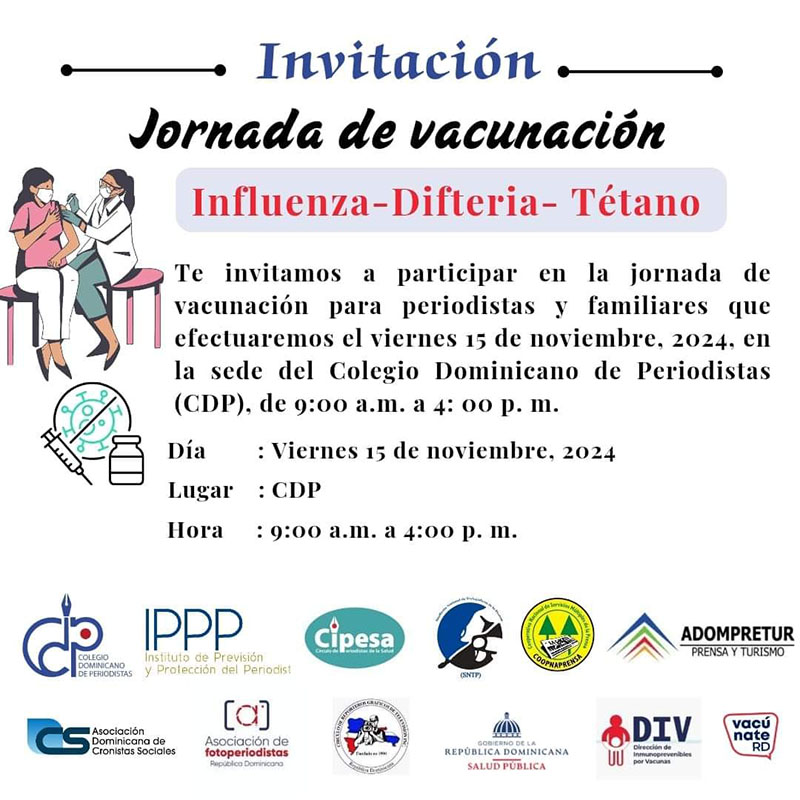 Santo Domingo. – Una jornada de vacunación contra la influenza, la difteria y el tétanos será efectuada este viernes 15 de noviembre, en la sede del Colegio Dominicano de Periodistas (CDP).