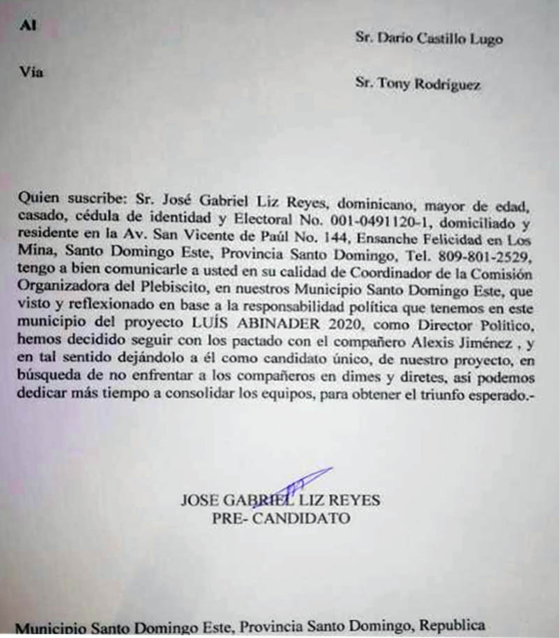 El abandono por Liz está contenida en una carta que él dirigió a Darío Castillo Lugo, Coordinador de la Comisión que Organiza un plebiscito, vía Tóny Rodríguez. Los dos son altos cargos del sector que sigue a Luis Abinader en SDE.