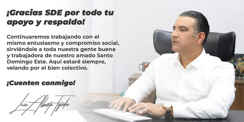 Luís Alberto Tejeda, el candidato a alcalde de Santo Domingo Este por el Partido de la Liberación Dominicana (PLD) agradeció a los munícipes por el respaldo recibido en las elecciones del pasado domingo 18, al tiempo de reafirmar su compromiso de «continuar trabajando por el bien colectivo».