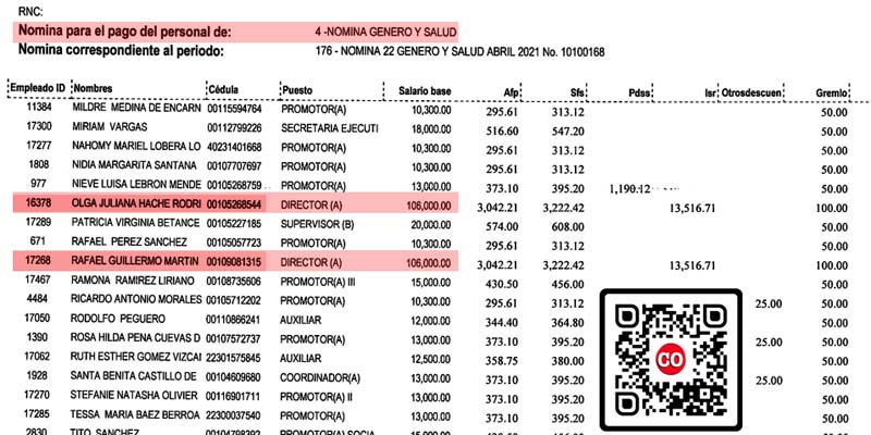 Según muestra la nómina del ASDE, en su apartado de Nómina de Genero y Salud del pasado 23 de abril del 2021, en esa dependencia hay una Directora y un Director.