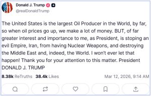 RT.-«Estados Unidos es, con diferencia, el mayor productor de petróleo del mundo, así que cuando los precios del petróleo suben, ganamos mucho dinero», sostuvo en la red Truth Social el presidente del país norteamericano, Donald Trump.
